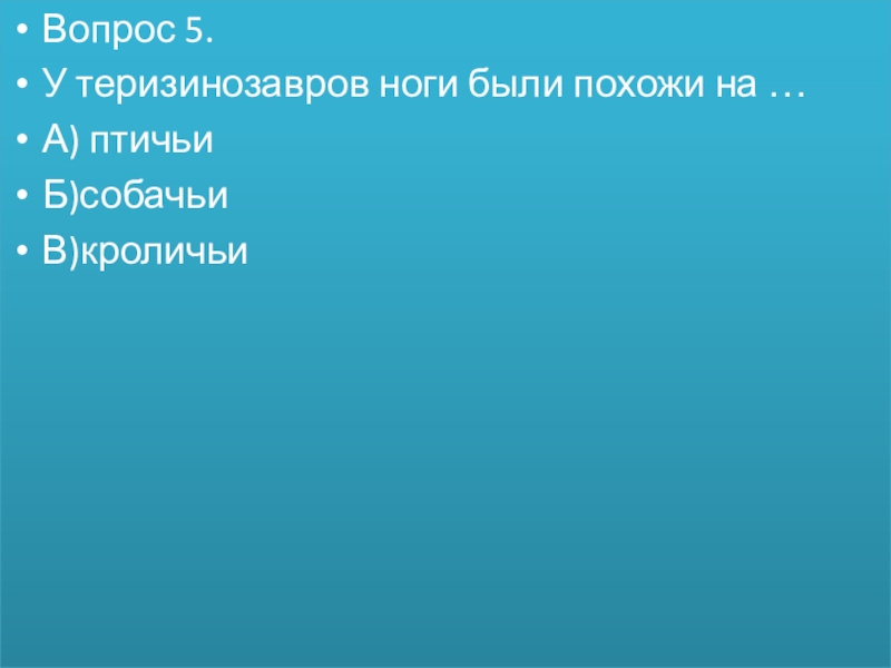 Вопрос 5.У теризинозавров ноги были похожи на …А) птичьиБ)собачьи В)кроличьи