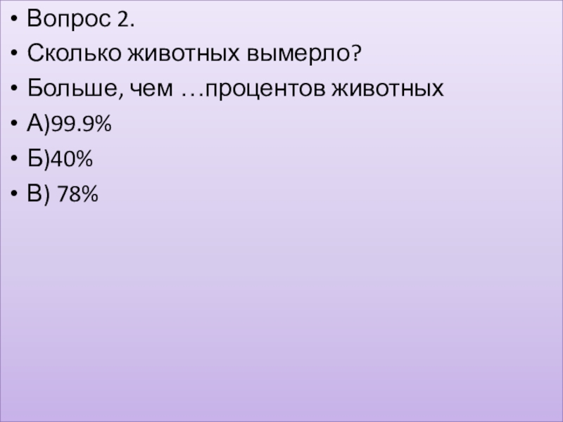 Вопрос 2.Сколько животных вымерло?Больше, чем …процентов животныхА)99.9%Б)40%В) 78%