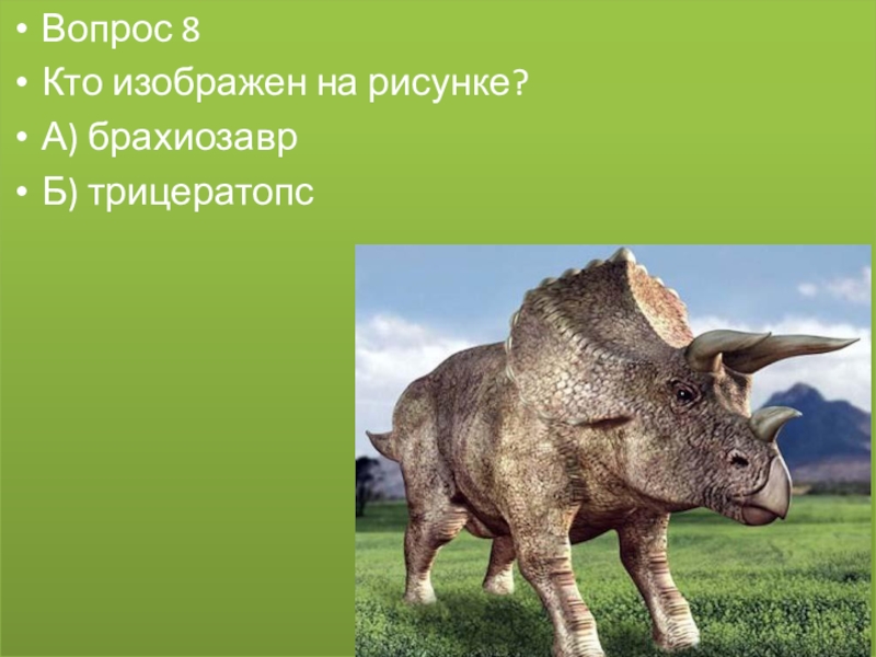 Вопрос 8Кто изображен на рисунке?А) брахиозаврБ) трицератопс