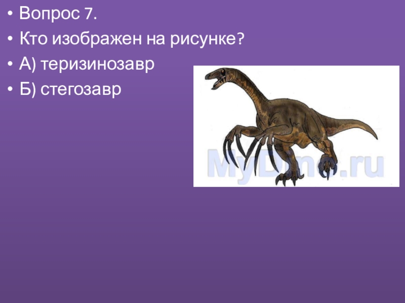 Вопрос 7.Кто изображен на рисунке?А) теризинозаврБ) стегозавр