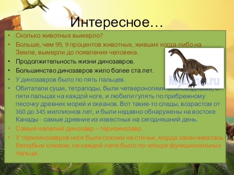 Интересное…Сколько животных вымерло?Больше, чем 99, 9 процентов животных, живших когда-либо на Земле, вымерли до появления человека. Продолжительность