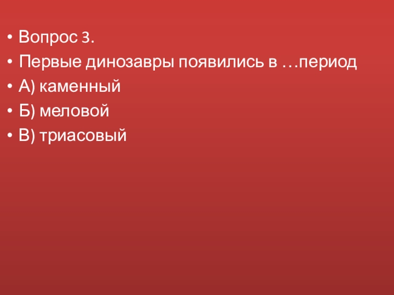 Вопрос 3.Первые динозавры появились в …периодА) каменныйБ) меловойВ) триасовый