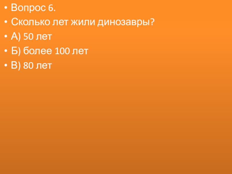 Вопрос 6.Сколько лет жили динозавры?А) 50 летБ) более 100 летВ) 80 лет