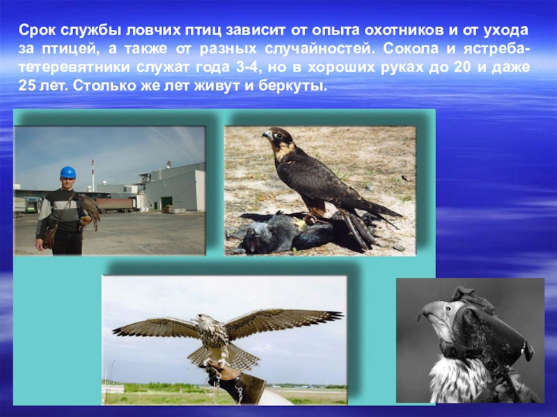 Слайд 7Срок службы ловчих птиц зависит от опыта охотников и от ухода