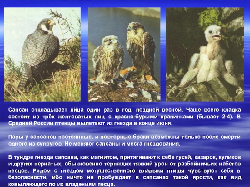 Слайд 13Сапсан откладывает яйца один раз в год, поздней весной. Чаще всего