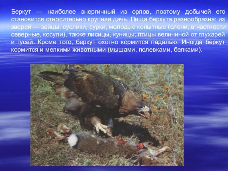 Слайд 29Беркут — наиболее энергичный из орлов, поэтому добычей его становится относительно
