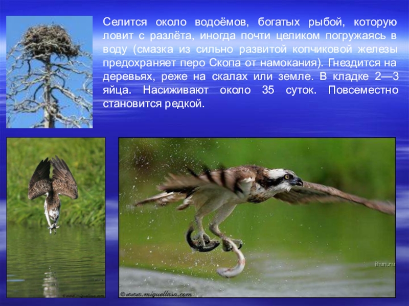 целиком погружаясь в воду (смазка из сильно развитой копчиковой железы предохраняет перо Скопа от намокания). Гнездится на деревьях, реже на скалах или земле. В кладке 2—3 яйца. Насиживают около 35 суток. Повсеместно становится редкой.