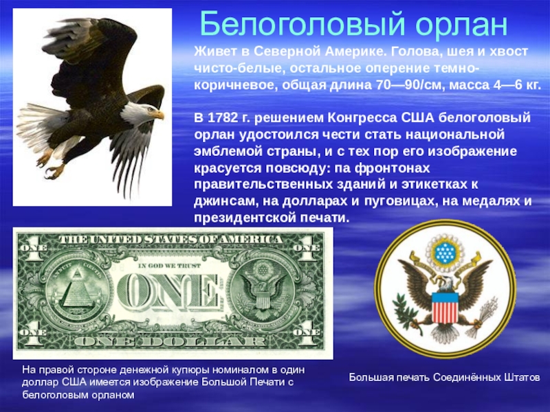 На правой стороне денежной купюры номиналом в один доллар США имеется изображение Большой Печати с белоголовым орланом