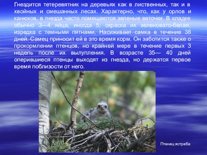 Слайд 19Гнездится тетеревятник на деревьях как в лиственных, так и в хвойных