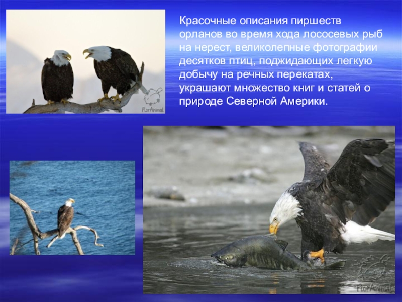 Слайд 25Красочные описания пиршеств орланов во время хода лососевых рыб на нерест,