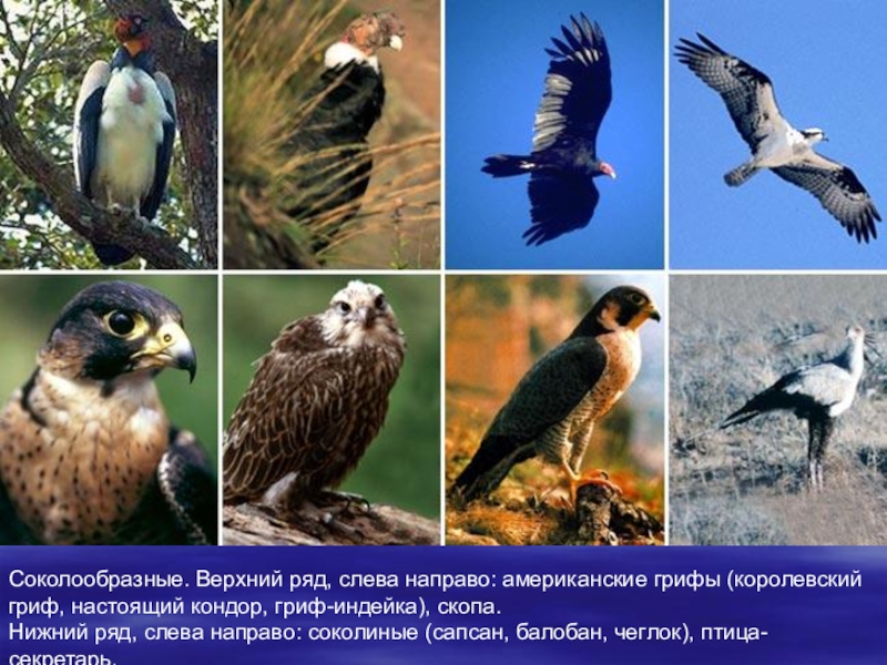 Слайд 34Соколообразные. Верхний ряд, слева направо: американские грифы (королевский гриф, настоящий кондор,