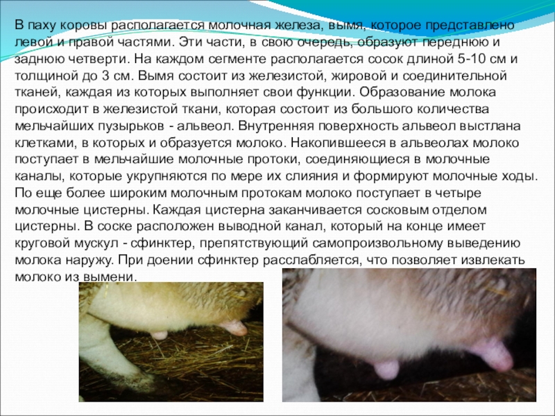 правой частями. Эти части, в свою очередь, образуют переднюю и заднюю четверти. На каждом сегменте располагается сосок длиной 5-10 см и толщиной до 3 см. Вымя состоит из железистой, жировой и соединительной тканей, каждая из которых выполняет свои функции. Образование молока происходит в железистой ткани, которая состоит из большого количества мельчайших пузырьков - альвеол. Внутренняя поверхность альвеол выстлана клетками, в которых и образуется молоко. Накопившееся в альвеолах молоко поступает в мельчайшие молочные протоки, соединяющиеся в молочные каналы, которые укрупняются по мере их слияния и формируют молочные ходы. По еще более широким молочным протокам молоко поступает в четыре молочные цистерны. Каждая цистерна заканчивается сосковым отделом цистерны. В соске расположен выводной канал, который на конце имеет круговой мускул - сфинктер, препятствующий самопроизвольному выведению молока наружу. При доении сфинктер расслабляется, что позволяет извлекать молоко из вымени.
