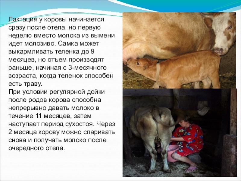 Слайд 17Лактация у коровы начинается сразу после отела, но первую неделю вместо