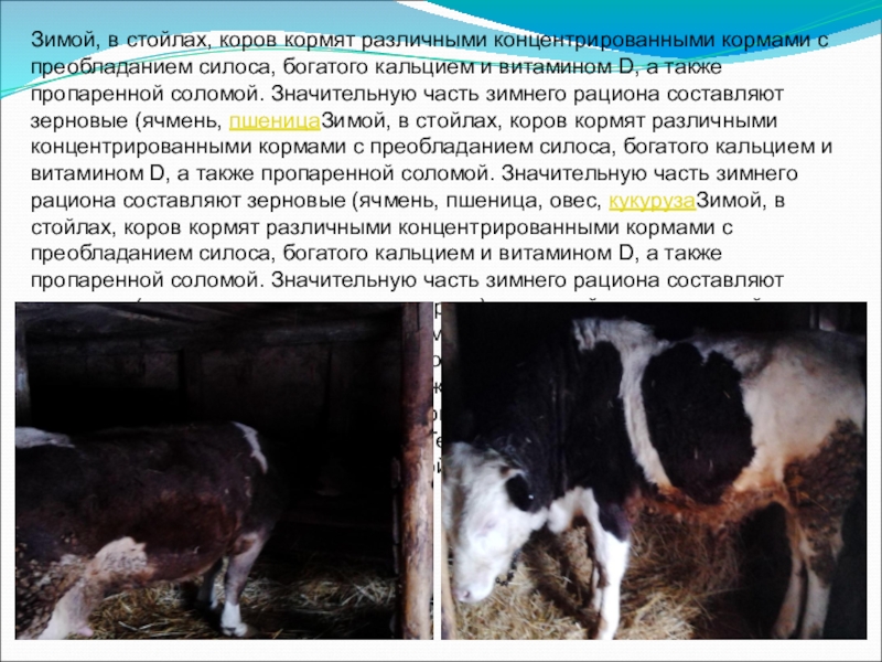 Слайд 14Зимой, в стойлах, коров кормят различными концентрированными кормами с преобладанием силоса,