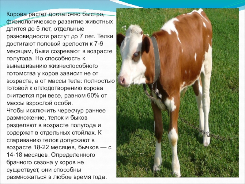 Слайд 15Корова растет достаточно быстро, физиологическое развитие животных длится до 5 лет,