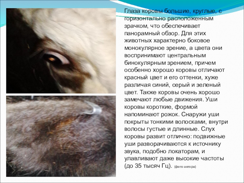 обзор. Для этих животных характерно боковое монокулярное зрение, а цвета они воспринимают центральным бинокулярным зрением, причем особенно хорошо коровы отличают красный цвет и его оттенки, хуже различая синий, серый и зеленый цвет. Также коровы очень хорошо замечают любые движения. Уши коровы короткие, формой напоминают рожок. Снаружи уши покрыты тонкими волосками, внутри волосы густые и длинные. Слух коровы развит отлично: подвижные уши разворачиваются к источнику звука, подобно локаторам, и улавливают даже высокие частоты (до 35 тысяч Гц). (фото автора)