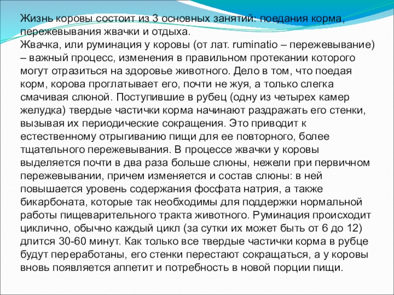 Жвачка, или руминация у коровы (от лат. ruminatio – пережевывание) – важный процесс, изменения в правильном протекании которого могут отразиться на здоровье животного. Дело в том, что поедая корм, корова проглатывает его, почти не жуя, а только слегка смачивая слюной. Поступившие в рубец (одну из четырех камер желудка) твердые частички корма начинают раздражать его стенки, вызывая их периодические сокращения. Это приводит к естественному отрыгиванию пищи для ее повторного, более тщательного пережевывания. В процессе жвачки у коровы выделяется почти в два раза больше слюны, нежели при первичном пережевывании, причем изменяется и состав слюны: в ней повышается уровень содержания фосфата натрия, а также бикарбоната, которые так необходимы для поддержки нормальной работы пищеварительного тракта животного. Руминация происходит циклично, обычно каждый цикл (за сутки их может быть от 6 до 12) длится 30-60 минут. Как только все твердые частички корма в рубце будут переработаны, его стенки перестают сокращаться, а у коровы вновь появляется аппетит и потребность в новой порции пищи.
