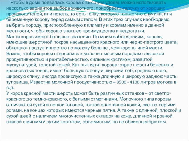 Масти коров имеют большое значение. По моим наблюдениям , коровы, имеющие шерстяной покров насыщенного красного или черно-пестрого цвета, обладают продуктивностью по молоку больше , чем коровы иной масти.