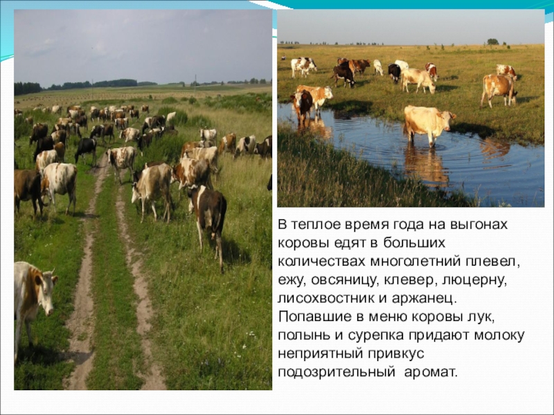 многолетний плевел, ежу, овсяницу, клевер, люцерну, лисохвостник и аржанец. Попавшие в меню коровы лук, полынь и сурепка придают молоку неприятный привкус подозрительный аромат.