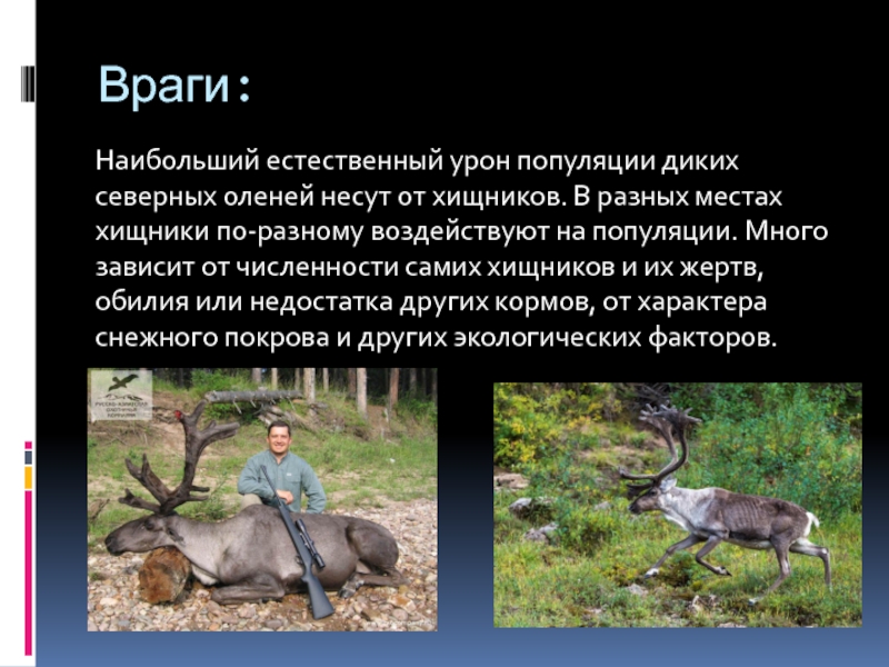 Враги: Наибольший естественный урон популяции диких северных оленей несут от хищников. В разных местах хищники по-разному воздействуют