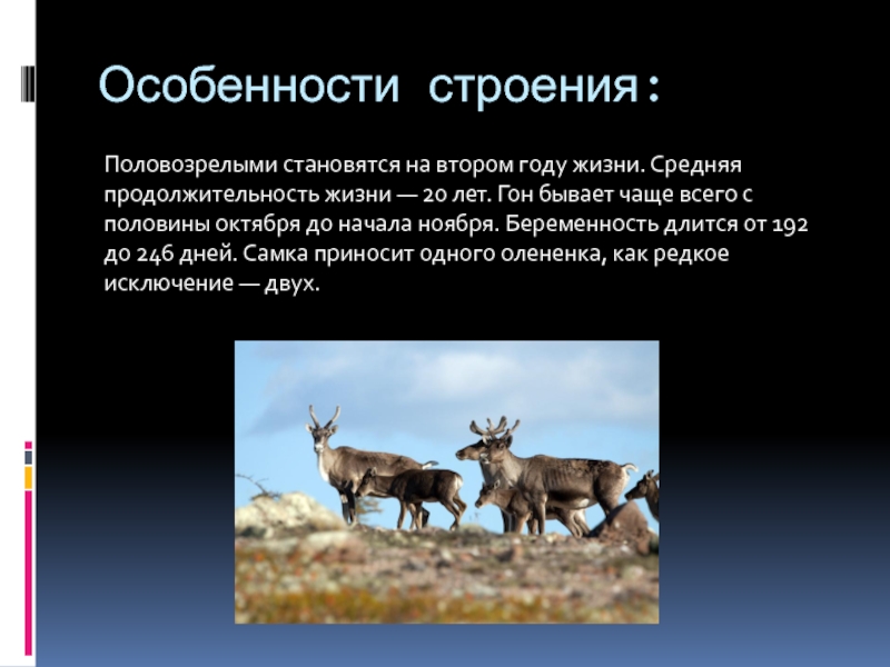 Особенности строения: Половозрелыми становятся на втором году жизни. Средняя продолжительность жизни — 20 лет. Гон бывает чаще всего