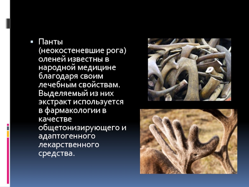 Слайд 9Панты (неокостеневшие рога) оленей известны в народной медицине благодаря своим лечебным
