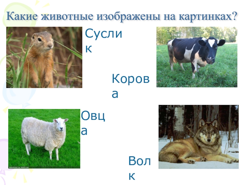 Какие животные изображены на картинках? СусликКороваОвцаВолк