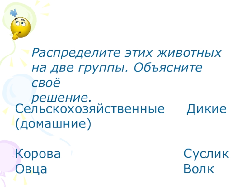Распределите этих животныхна две группы. Объясните своёрешение.Сельскохозяйственные   Дикие(домашние)