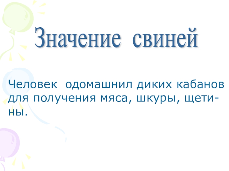 Значение свиней Человек одомашнил диких кабановдля получения мяса, шкуры, щети-ны.