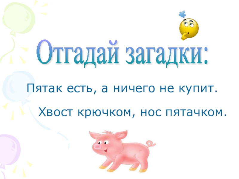 Отгадай загадки: Пятак есть, а ничего не купит.Хвост крючком, нос пятачком.