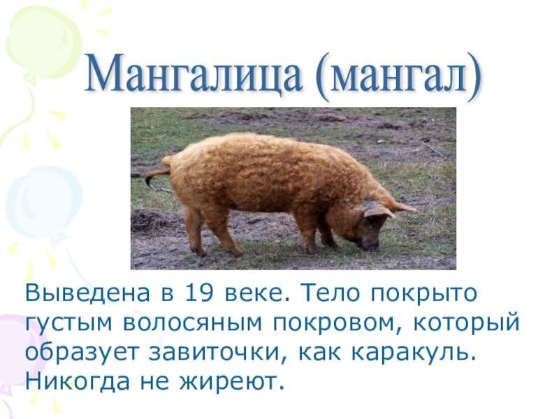 Мангалица (мангал) Выведена в 19 веке. Тело покрыто густым волосяным покровом, который образует завиточки, как каракуль.Никогда не