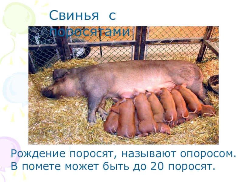Свинья с поросятамиРождение поросят, называют опоросом.В помете может быть до 20 поросят.