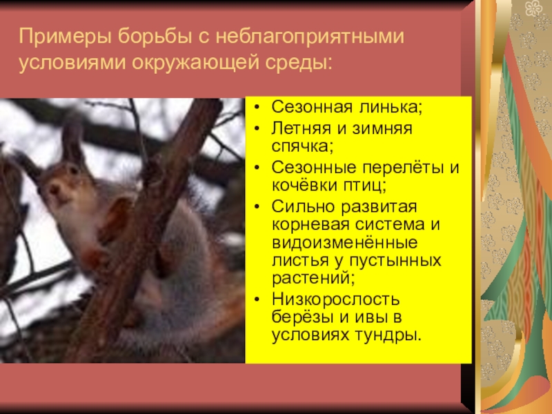 Примеры борьбы с неблагоприятными условиями окружающей среды:Сезонная линька;Летняя и зимняя спячка;Сезонные перелёты и кочёвки птиц;Сильно развитая корневая