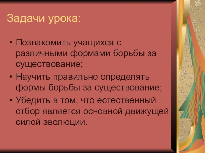 Задачи урока:Познакомить учащихся с различными формами борьбы за существование;Научить правильно определять формы борьбы за существование; Убедить в том, что естественный отбор является основной движущей силой эволюции.