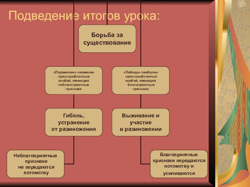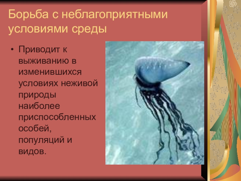 Борьба с неблагоприятными условиями средыПриводит к выживанию в изменившихся условиях неживой природы наиболее приспособленных особей, популяций и