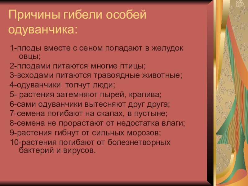 Причины гибели особей одуванчика:1-плоды вместе с сеном попадают в желудок овцы;2-плодами питаются многие птицы;3-всходами питаются травоядные животные;4-одуванчики