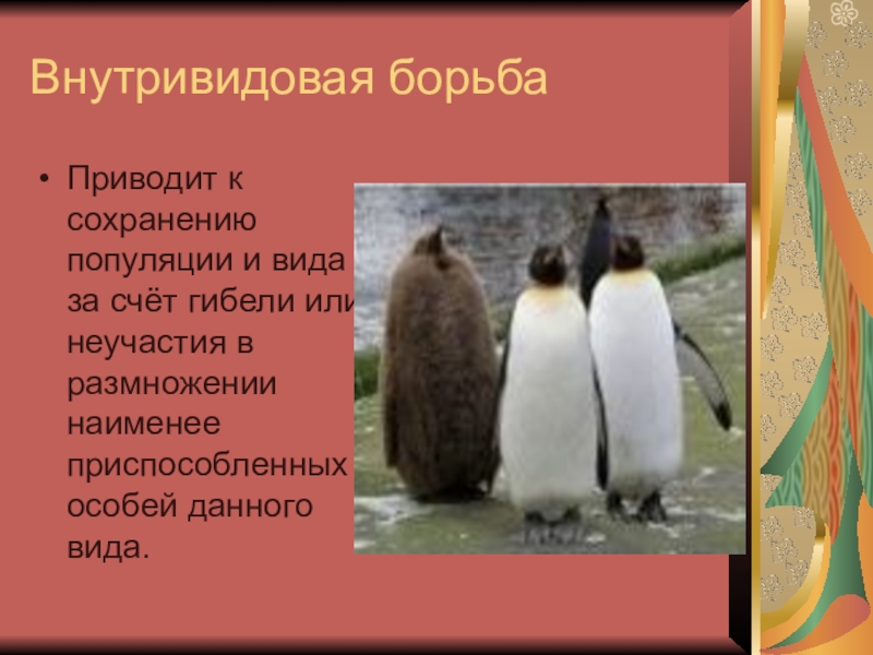 Внутривидовая борьбаПриводит к сохранению популяции и вида за счёт гибели или неучастия в размножении наименее приспособленных особей