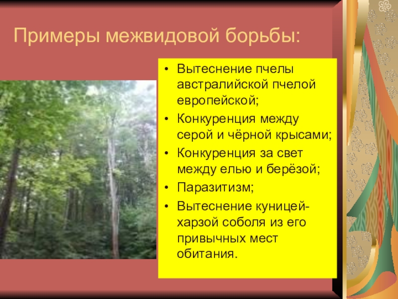 Примеры межвидовой борьбы:Вытеснение пчелы австралийской пчелой европейской;Конкуренция между серой и чёрной крысами;Конкуренция за свет между елью и
