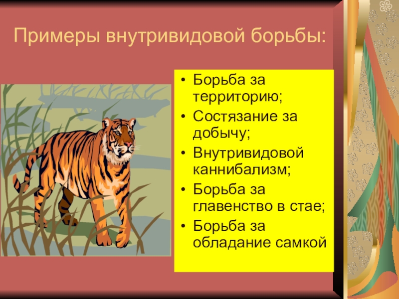 Примеры внутривидовой борьбы:Борьба за территорию;Состязание за добычу;Внутривидовой каннибализм;Борьба за главенство в стае;Борьба за обладание самкой