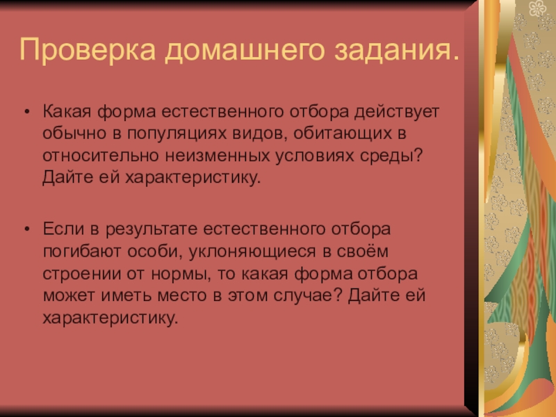 Проверка домашнего задания.Какая форма естественного отбора действует обычно в популяциях видов, обитающих в относительно неизменных условиях среды?