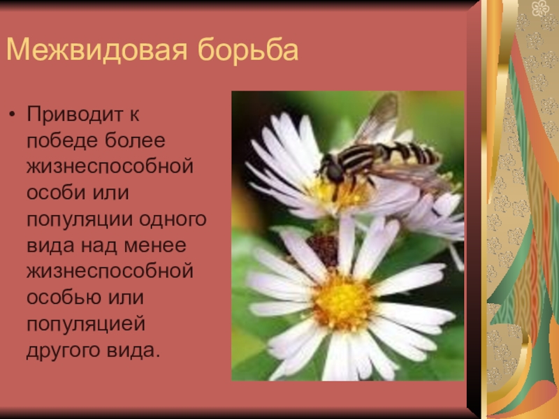Межвидовая борьбаПриводит к победе более жизнеспособной особи или популяции одного вида над менее жизнеспособной особью или популяцией