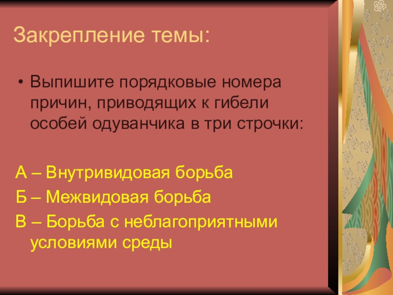 Закрепление темы:Выпишите порядковые номера причин, приводящих к гибели особей одуванчика в три строчки:А – Внутривидовая борьбаБ –