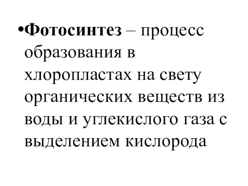 Фотосинтез – процесс образования в хлоропластах на свету органических веществ из воды и углекислого газа с выделением