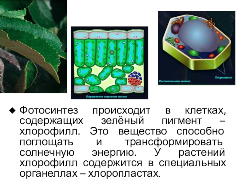 Слайд 32Фотосинтез происходит в клетках, содержащих зелёный пигмент – хлорофилл. Это вещество