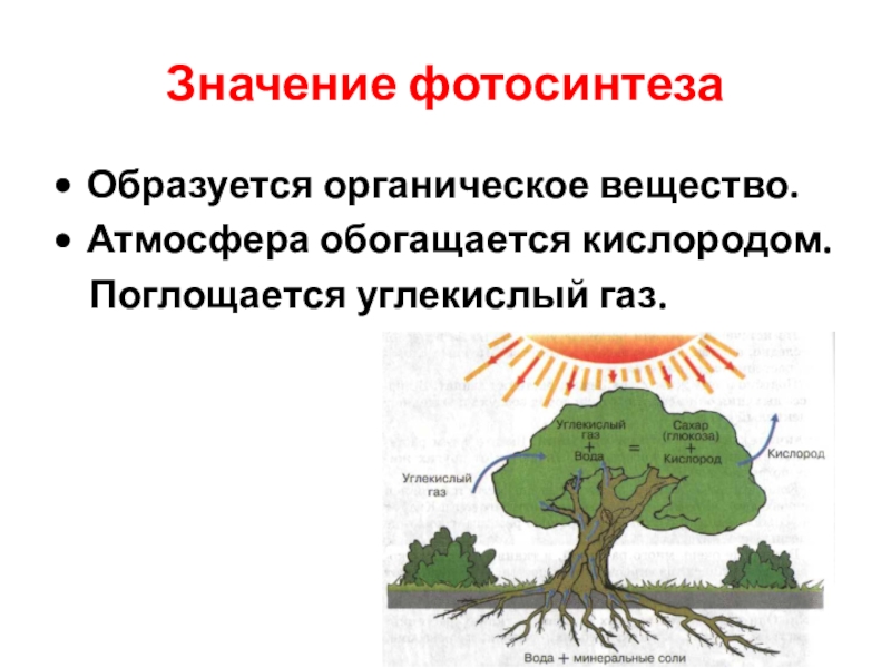 Значение фотосинтезаОбразуется органическое вещество.Атмосфера обогащается кислородом.  Поглощается углекислый газ.