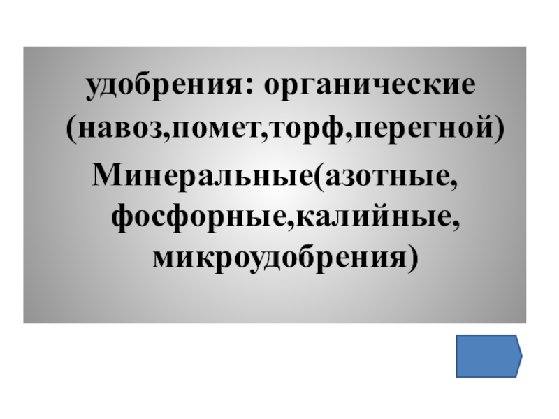 удобрения: органические(навоз,помет,торф,перегной)Минеральные(азотные, фосфорные,калийные, микроудобрения)