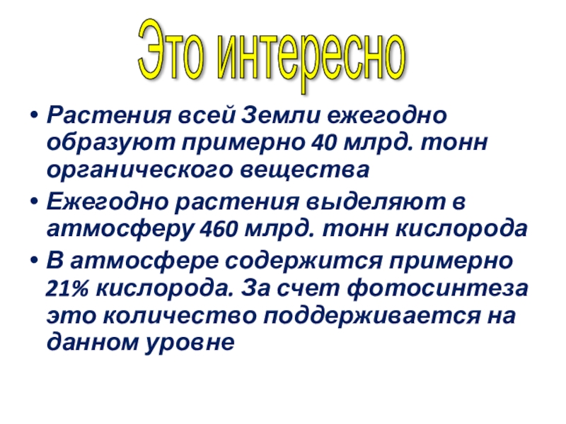 Растения всей Земли ежегодно образуют примерно 40 млрд. тонн органического веществаЕжегодно растения выделяют в атмосферу 460 млрд.