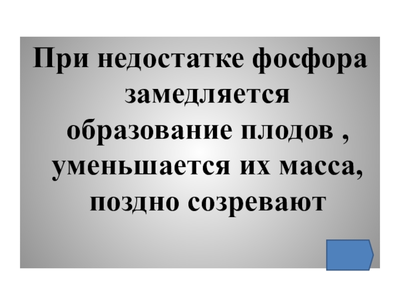 Слайд 28При недостатке фосфора замедляется образование плодов , уменьшается их масса, поздно