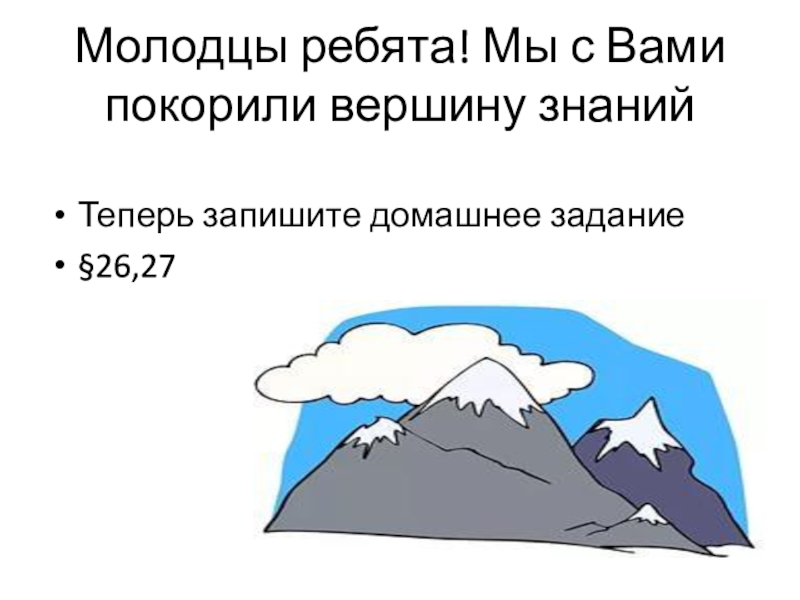 Молодцы ребята! Мы с Вами покорили вершину знаний Теперь запишите домашнее задание§26,27