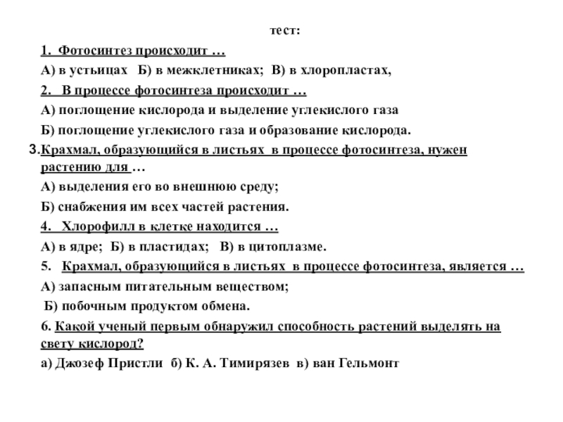 тест:1. Фотосинтез происходит …А) в устьицах  Б) в межклетниках; В) в хлоропластах,2.  В процессе фотосинтеза